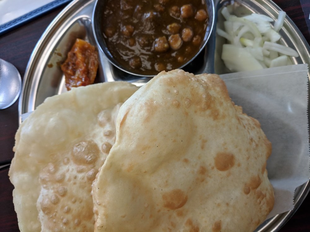 Taste and Texture: The taste can vary, but generally, the chickpea curry offers a spicy and tangy flavor profile, complemented by the soft and airy texture of the deep-fried bhatura.