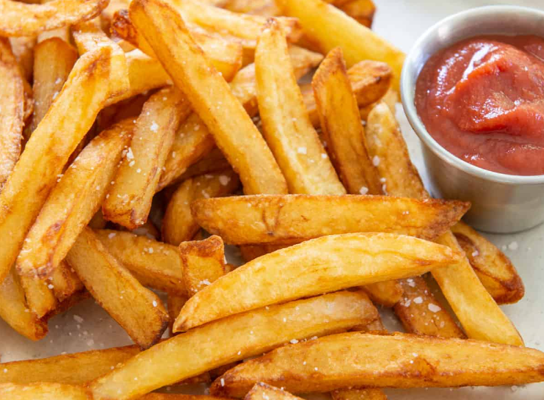 French fries are a popular side dish or snack consisting of deep-fried potato strips, typically served hot and crispy. They are commonly seasoned with salt and enjoyed with various condiments like ketchup, mayonnaise, or vinegar. The texture is often described as crispy on the outside and soft on the inside.