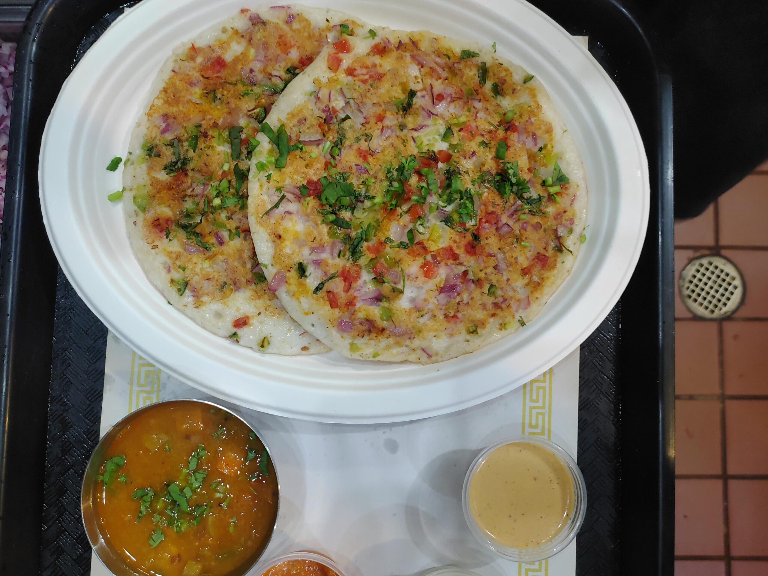 Tomato onion chili uttapam is a popular savory pancake from South India made with a fermented batter of rice and urad dal (black lentils), topped with a flavorful mixture of chopped onions, tomatoes, and green chilies.